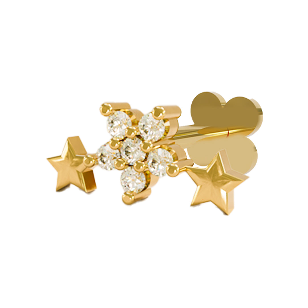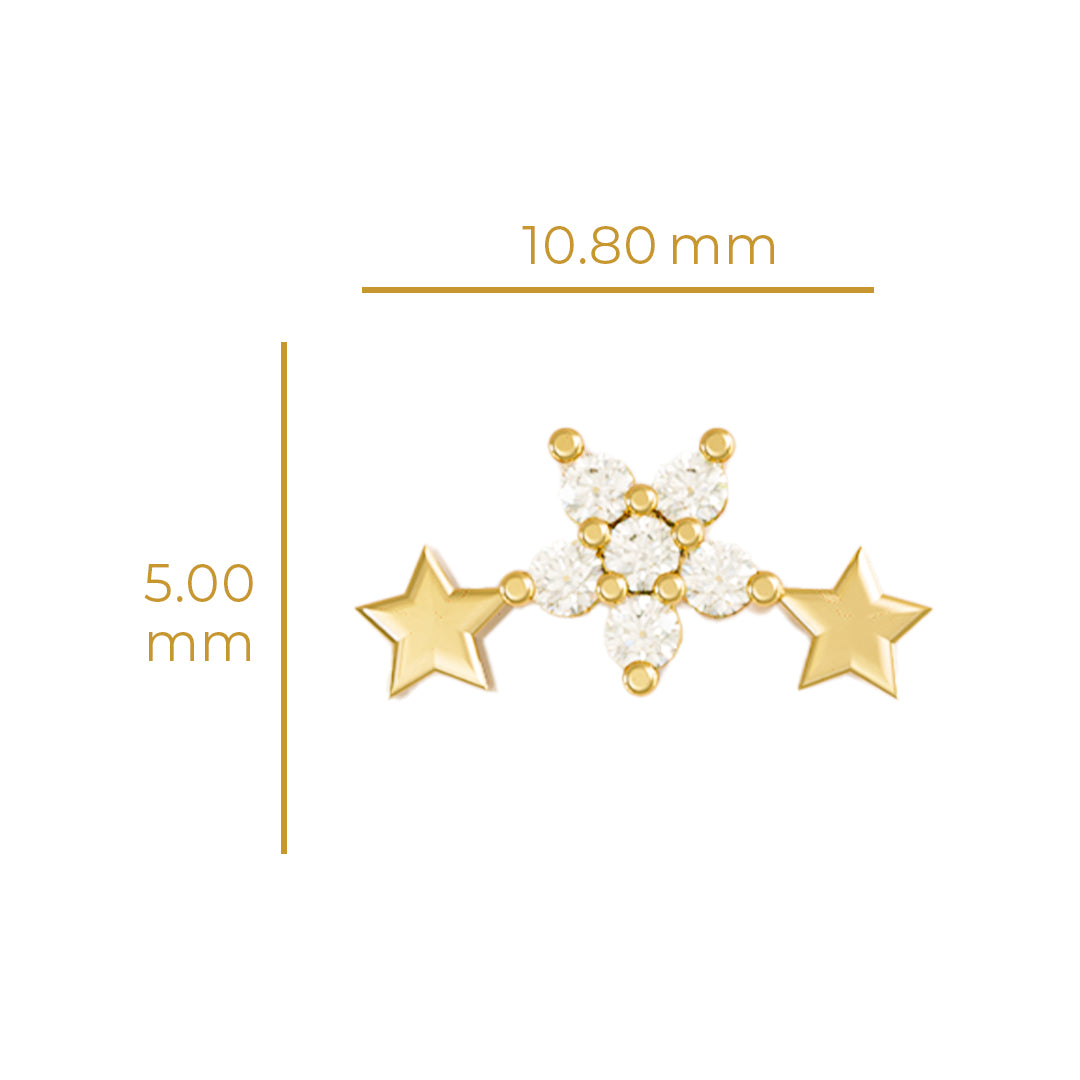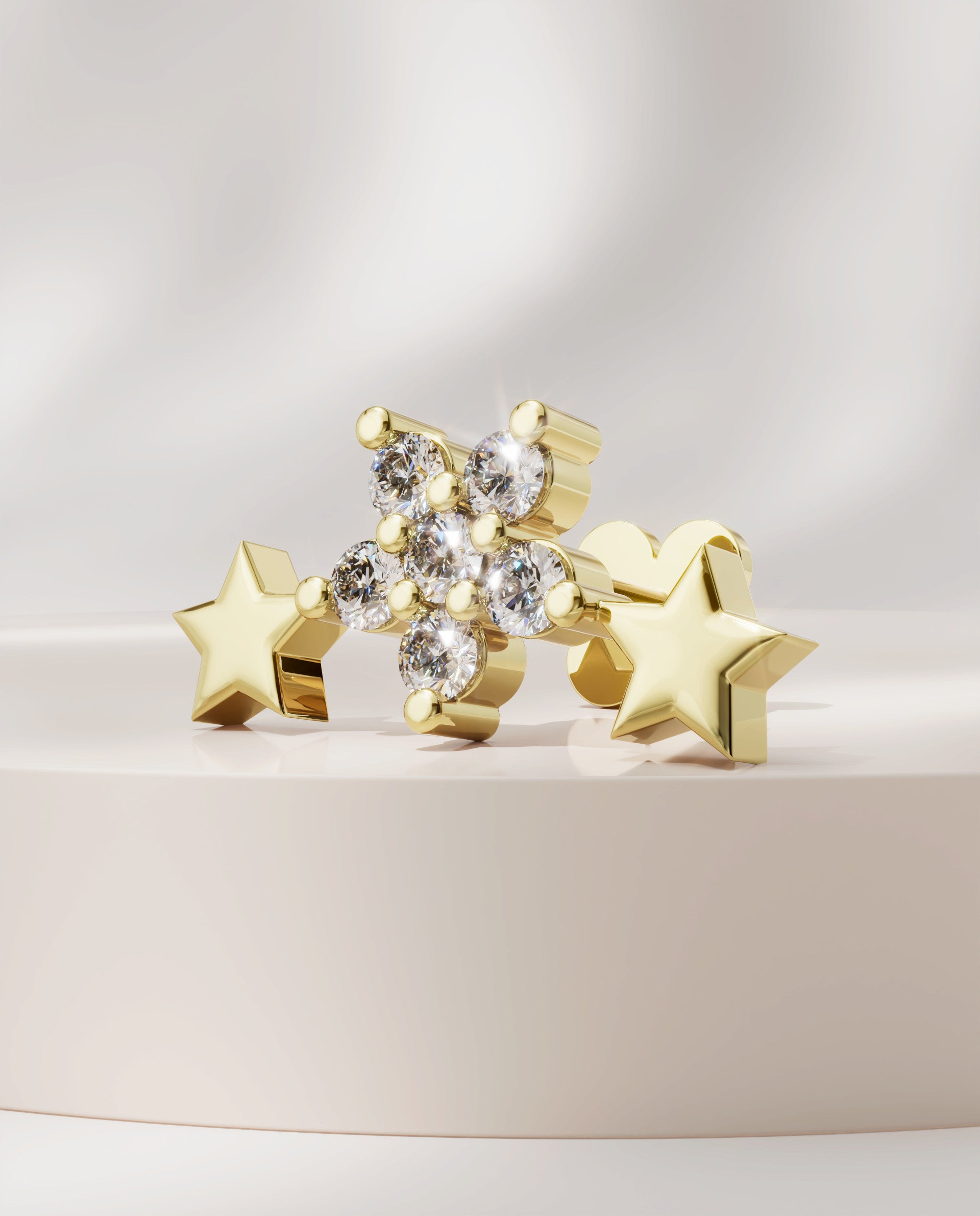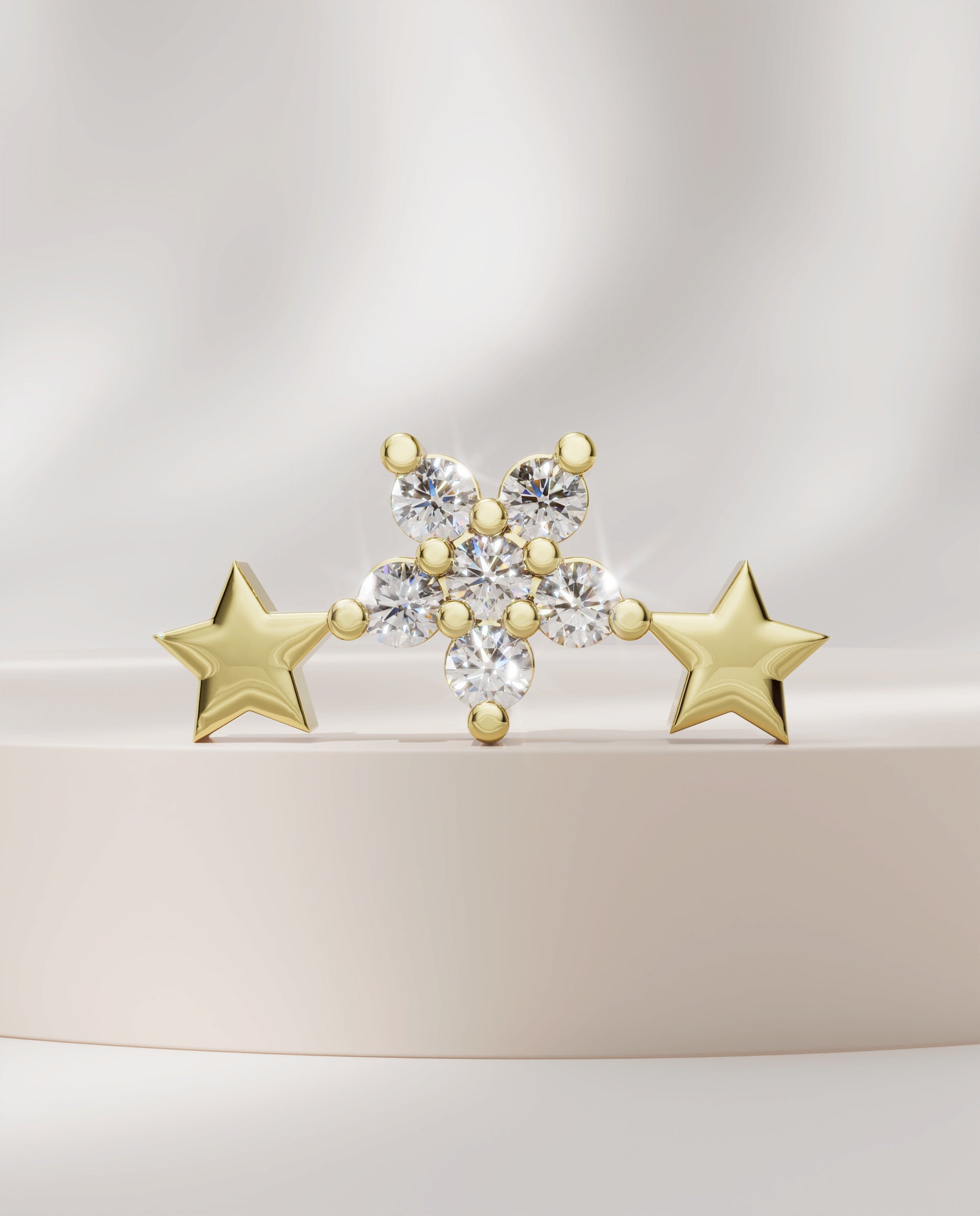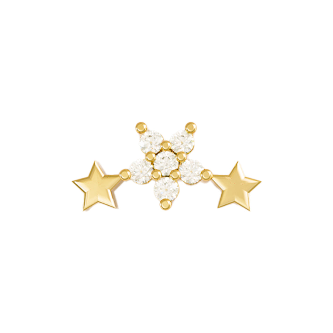 Adorn yourself with the 3 Flower Mix earrings — 18k gold crafted with a central flower and stars at each end for a touch of celestial elegance.